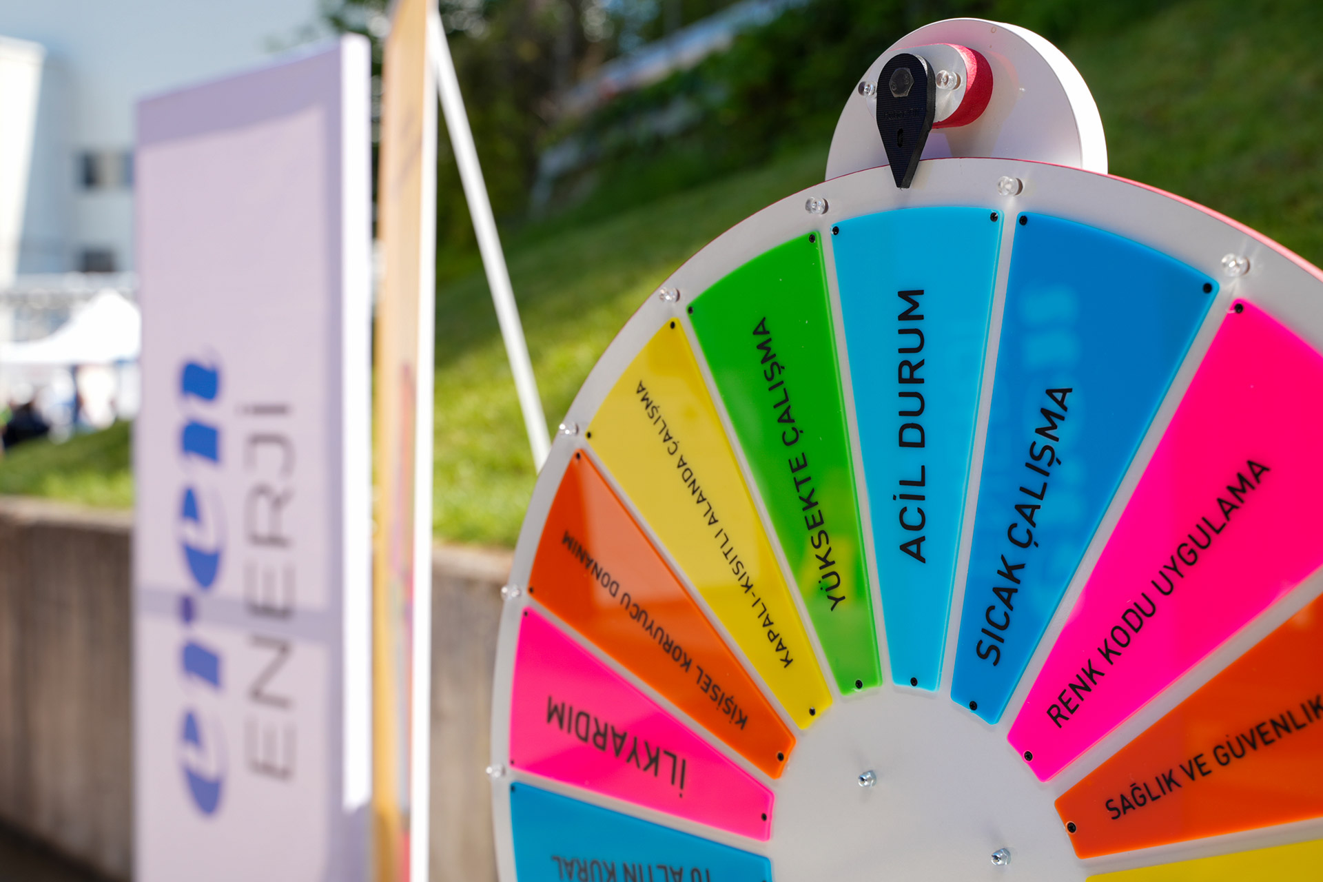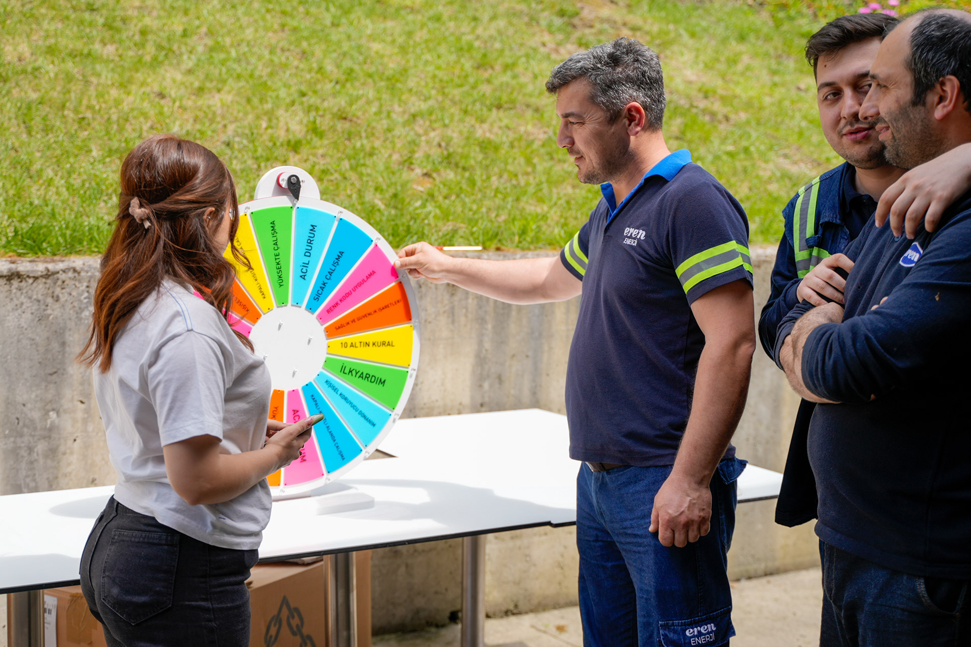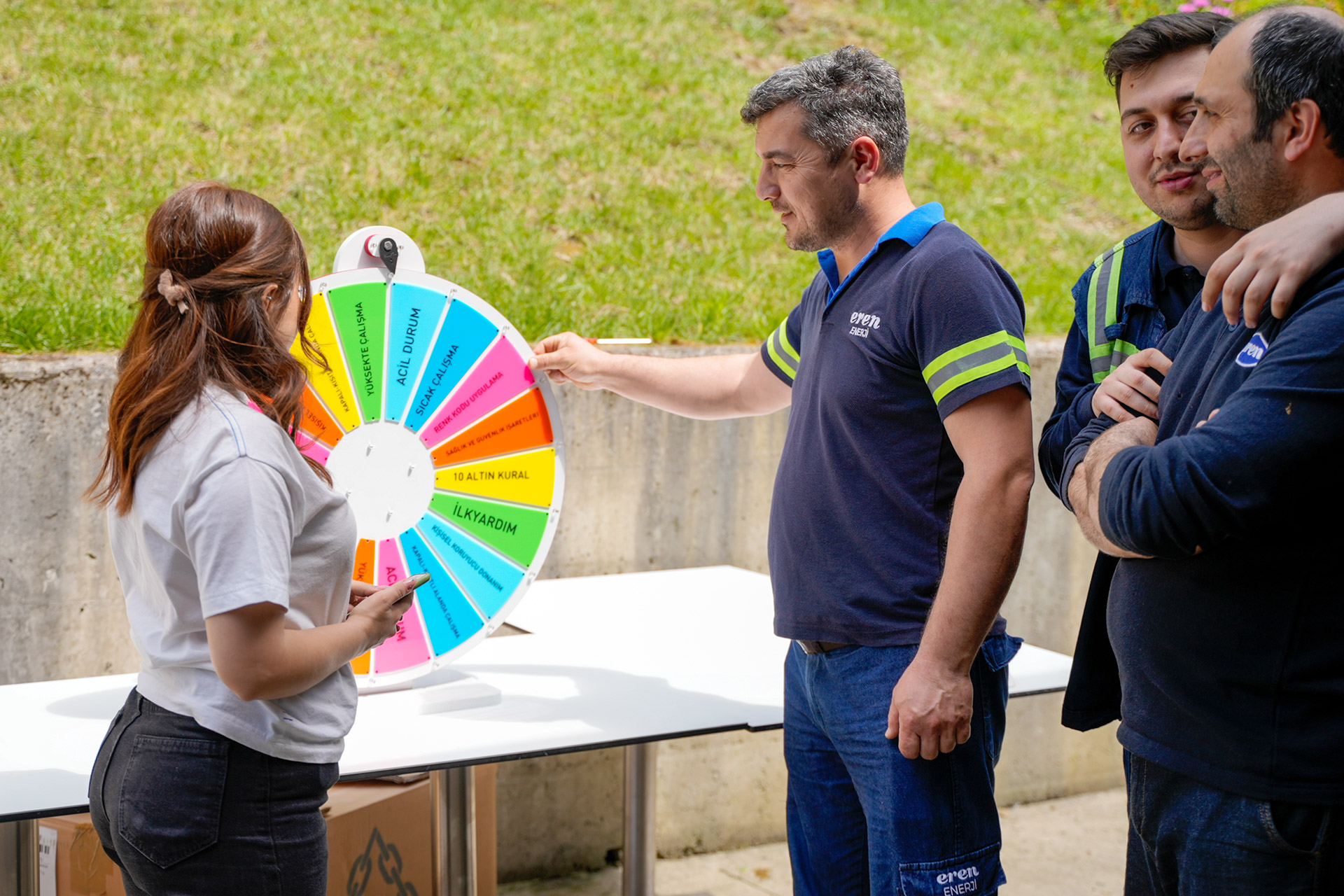 Eğitim ve oyunu bir araya getiren bu interaktif çark etkinliğinde çalışanlar, çarkın getirdiği sorular ve görevlerle İSG konularını keşfeder. Öğrenmeyi hızlandıran, dikkat çekici bir yöntemdir.